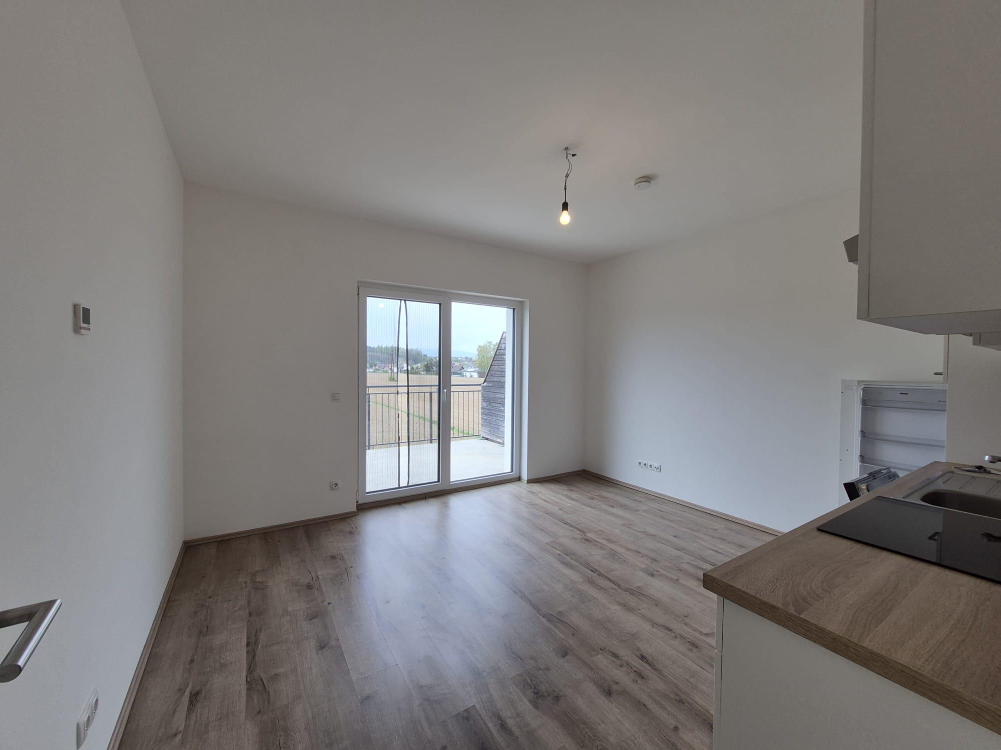 Moderne Single/Paar Wohnung mit großzügiger Terrasse im 1. Obergeschoss umfasst einen Vorraum, Bad mit WC, ein Schlafzimmer und einen offenen Wohn-/Ess-/Küchenbereich von dem aus die weitläufige Terrasse über eine Hebeschiebetüre erschließbar ist.